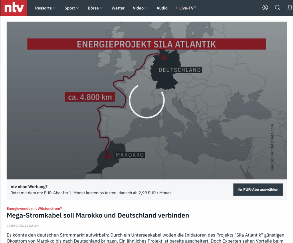 As seen in January 28, 2026 Ntv | Mega power cable to connect Morocco and Germany As seen in January 28, 2026 Read the article Share Twitter Email Share